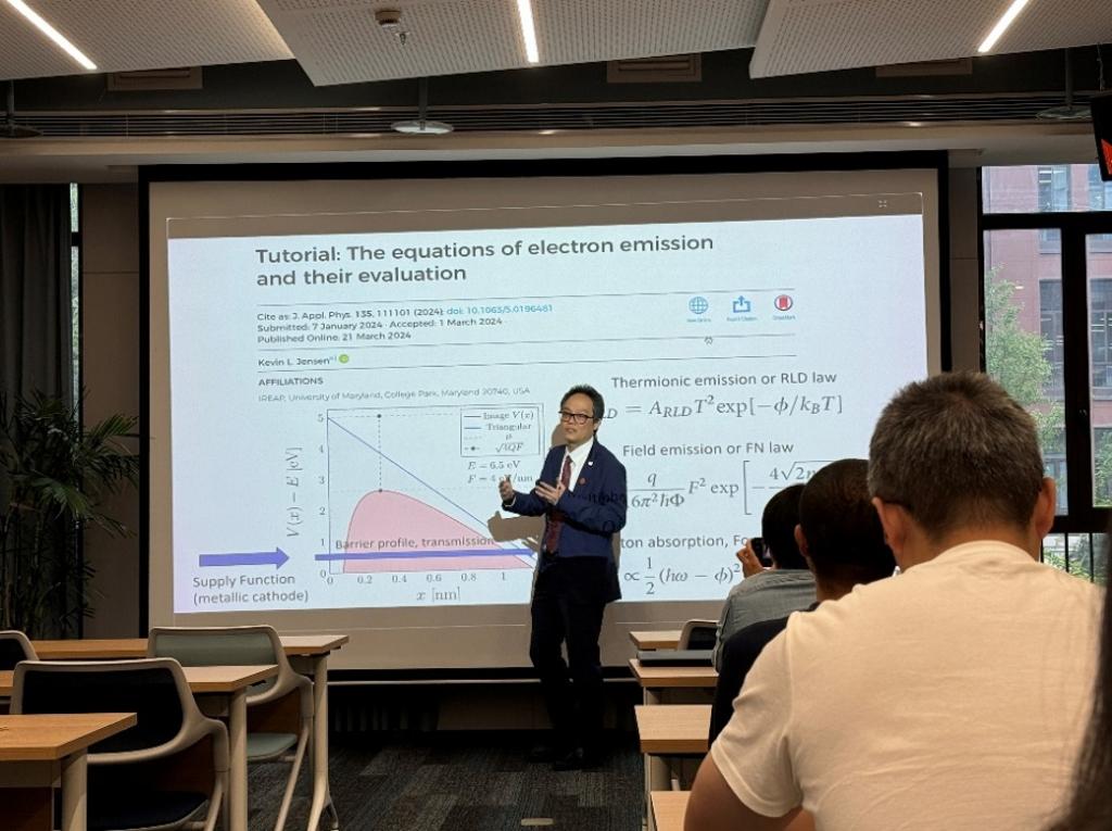 聘任仪式后,Lay Kee Ang做题为“二维材料电子发射模型及应用”(“Modern models of electron emission for 2D materials and its applications”)的学术报告,回顾了场致电子发射的经典理论模型,详细介绍了团队在二维材料场发射理论方面的最新进展,并创新性的提出了基于分数维度的场发射模型,可以很好解释纳米尺度的场发射行为。研讨环节,与会师生就二维材料场发射、热电子发射和光电发射等问题与Lay Kee Ang开展了深入的交流和讨论。