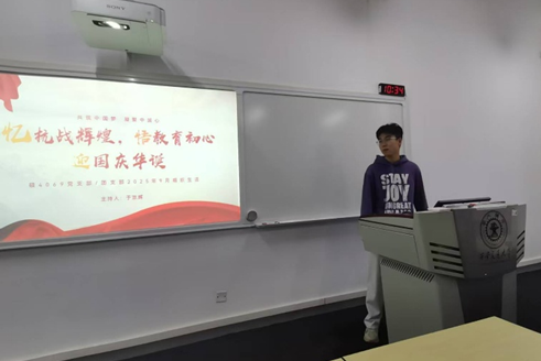 9月25日,硕4069党团支部在HJC黄金城登录创新港校区3-6013教室举行了以“忆抗战辉煌,悟教育初心,迎国庆华诞”为主题的组织生活。会议主要围绕纪念抗战胜利80周年,引导青年群体领悟教育家精神,庆祝中华人民共和国成立76周年。会议由于京辉主持,全体党支部和团支部成员参与。