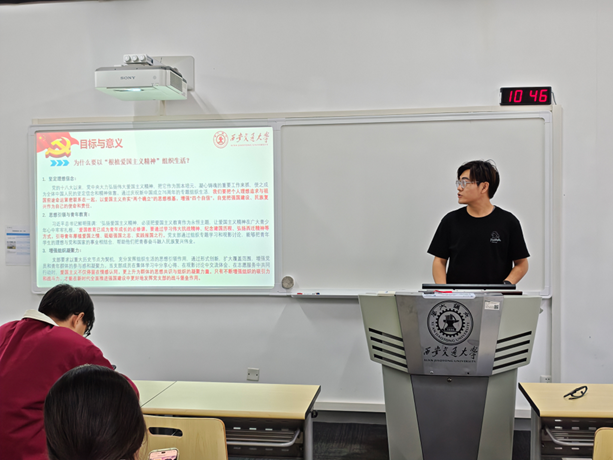 李祖琦以“根植爱国主义精神”为主题,带领同学们回顾新中国成立76周年的奋斗历程。他首先阐述了爱国主义精神的目标与意义,强调要坚定理想信念、加强青年思想引领、增强组织凝聚力,引导同学们将个人理想融入国家发展大局。通过回顾建国初期到改革开放的历史进程以及新时代在科技、基础设施、社会发展等方面的辉煌成就,他激励青年一代厚植爱国情怀、砥砺报国之志。与会成员共同观看了《建国大业》和《厉害了,我的国》影片片段,直观感受国家从奠基到腾飞的伟大征程。李祖琦还组织学习了习近平总书记关于爱国主义的重要论述,深入阐释爱国主义作为中华民族精神核心的当代内涵,强调爱国与爱党、爱社会主义高度统一,并号召大家将“爱国情、强国志、报国行”融入科研学习与成长实践,以实际行动投身强国建设。