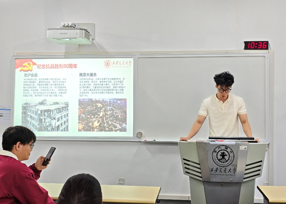 罗丁源带领大家学习了纪念抗战胜利80周年的相关内容。他介绍了中国人民抗日战争的由来和详细历程,从1931年九一八事变爆发开始,中国人民进行了长达14年的艰苦卓绝抗战,并重点讲述了七七事变、淞沪会战、南京大屠杀、台儿庄大捷等关键历史事件。此外,他阐述了伟大抗战精神的内涵,包括爱国主义、团结奋斗和坚韧不屈,以及这一精神与当前中国式现代化建设和民族复兴伟业之间的深刻联系。他还以历史虚无主义、民族分裂倾向和和平遗忘现象为反例,详细阐述了传承和弘扬抗战精神在凝聚民族力量、维护国家统一和推动社会进步中的重要意义。