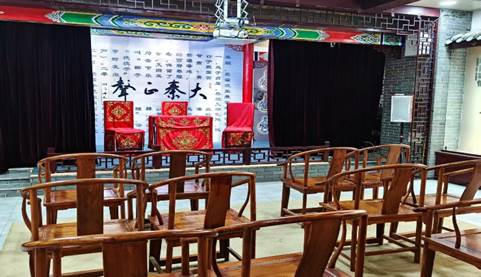 馆内的演出区域,古色古香的布置映入眼帘,还原了秦腔表演的场景。舞台上,装饰华丽的桌椅披着红底金花的布饰,背景上的文字诉说着秦腔的渊源,让人仿佛能听见那激昂的唱腔。想象一下,演员们曾在这里粉墨登场,用高亢激昂的嗓音演绎着历史的风云变幻、人间的悲欢离合。